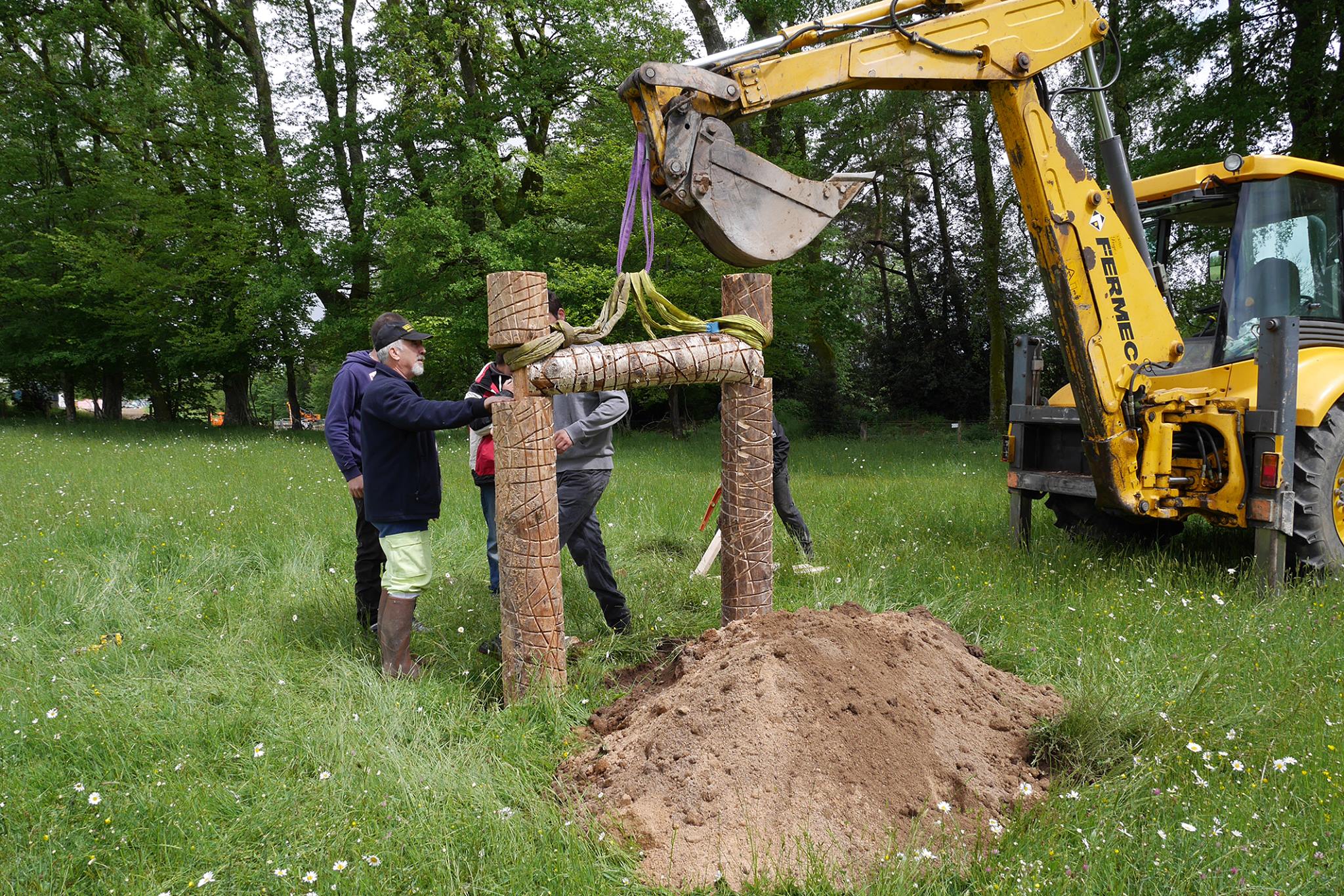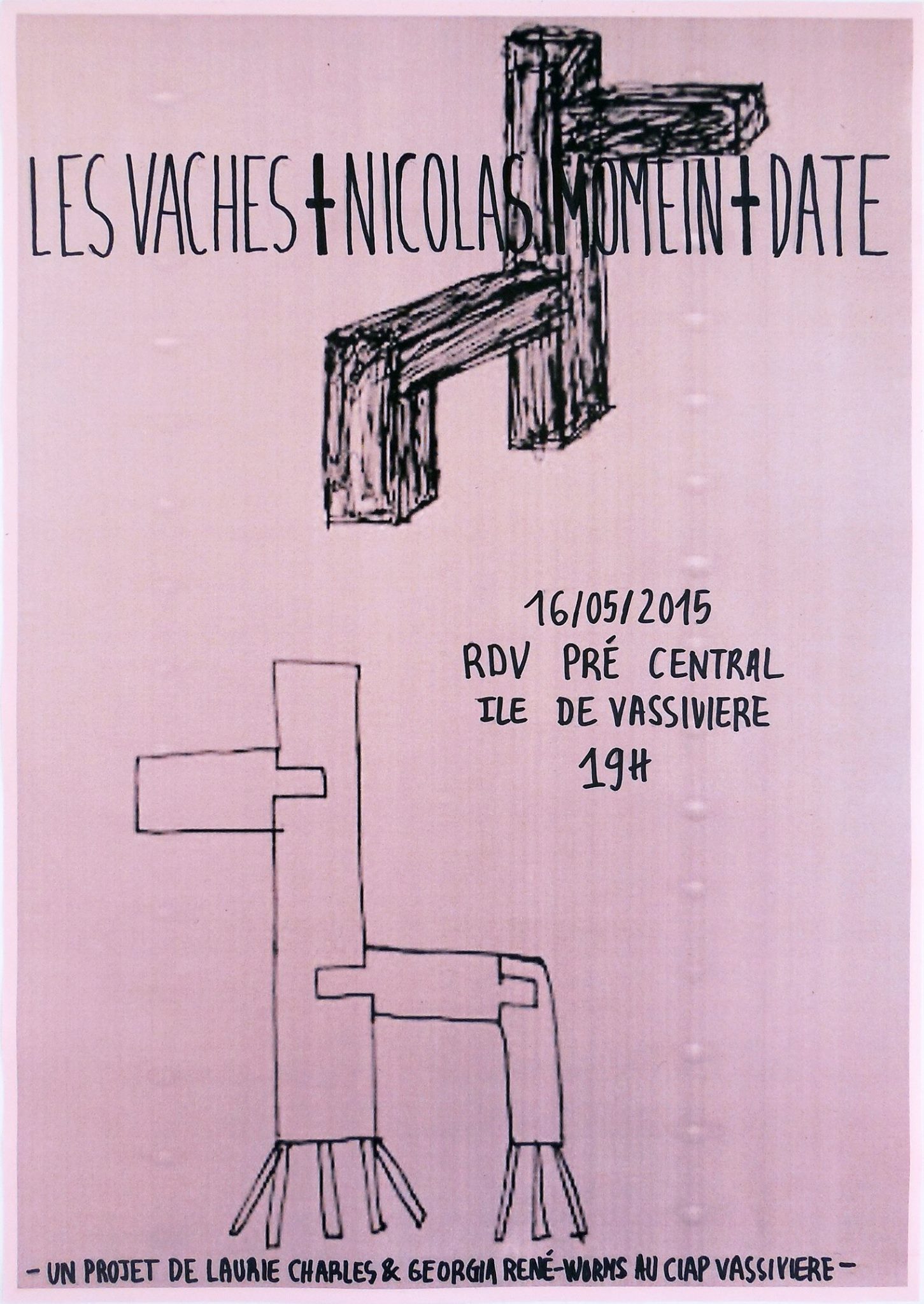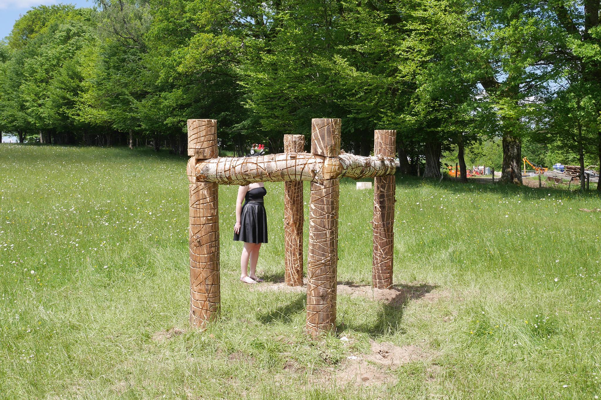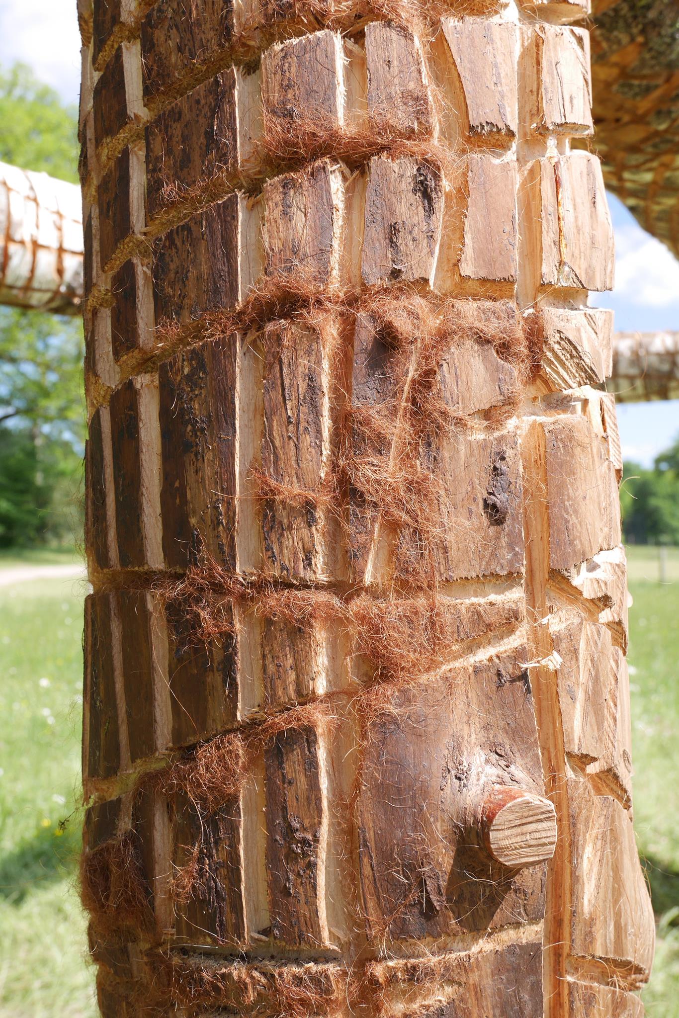 « En partenariat avec le centre d’art et avec le soutient des employés du Syndicat de l’île, Nicolas Momein a pu récupérer du bois et d’autres matériaux complémentaires sur place, travailler la matière principale à la tronçonneuse et assembler les pièces dans le parc. Ce totem inspiré des architectures à ferrer, a pour fonction de permettre aux vaches de se gratter le dos. Par cette action, les vaches patinent la structure, des poils se collent à la résine pour donner un rendu unique. Fasciné par la relation au soin entre homme et animal (…)Les « sculptures-machines servent à la fois au bien-être des bêtes et donnent vie par leur actions à une oeuvre. »